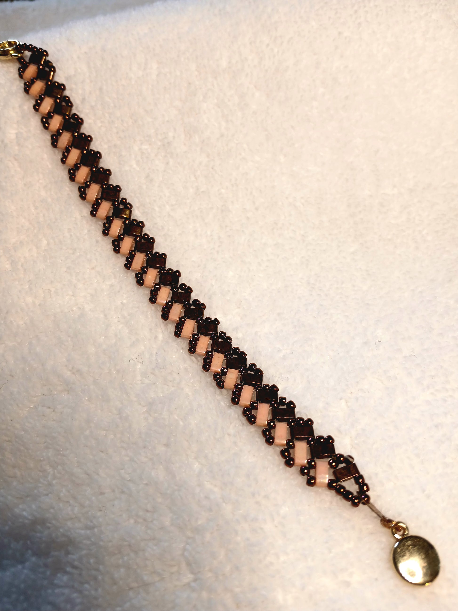 1/2 Miyuki Tila and Delicas seed beads weaved in a herringbone design. Measures 6" to 8" with an extension chain and charm. Widths 1/2" Comes in multiple colors and closures upon requests
